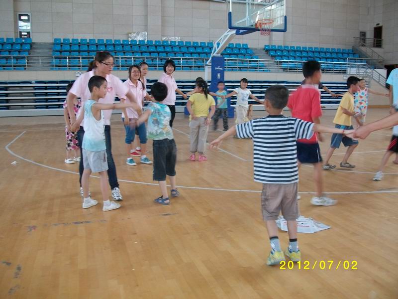 因天气炎热,主要带同学们参观了我校的体育馆,看到木地板的篮球馆、塑胶跑道的室内田径馆、pu质地的羽毛球馆、排球馆以及齐备的健身器材,孩子们兴奋不已。参观完体育馆后,在服务队志愿者的带领下,同学们还进行了“猫和老鼠”和“无敌风火轮”两项素质拓展游戏。在“猫和老鼠”游戏中,要求各位同学在游戏过程中要明确自己的位置,同时遇事要灵活多变。而“无敌风火轮”游戏的主要意义在于培养同学们的全局意识,培养系统思考、计划和组织能力,认识到团队合作的意义,让同学们在生活中学会竞争与合作,学会理解与总结。